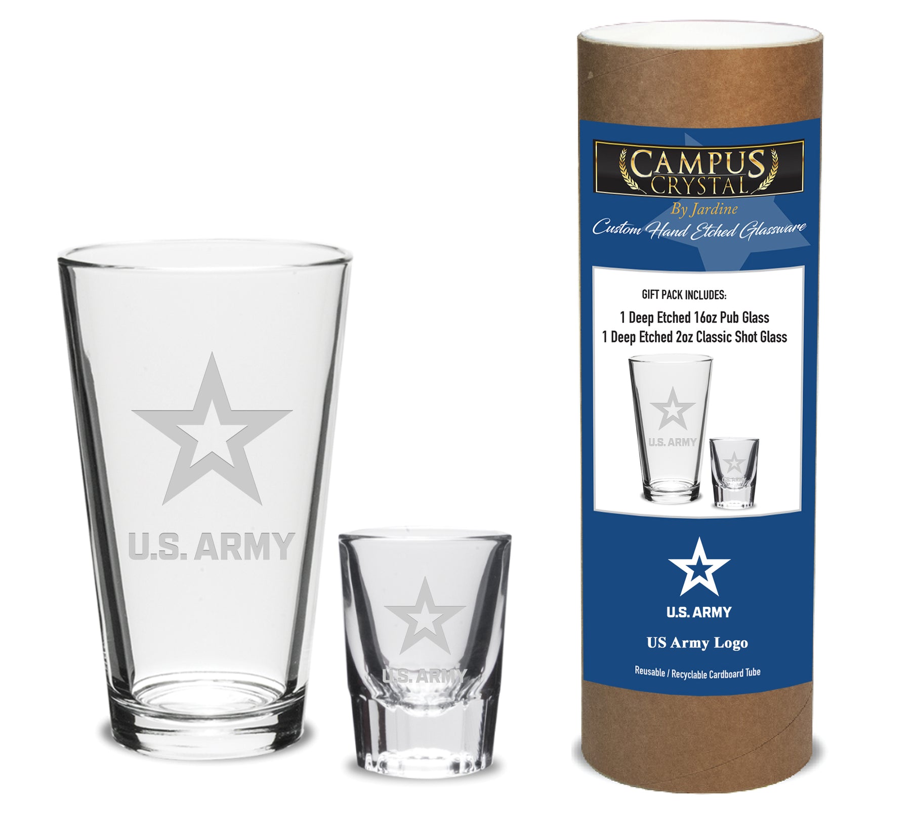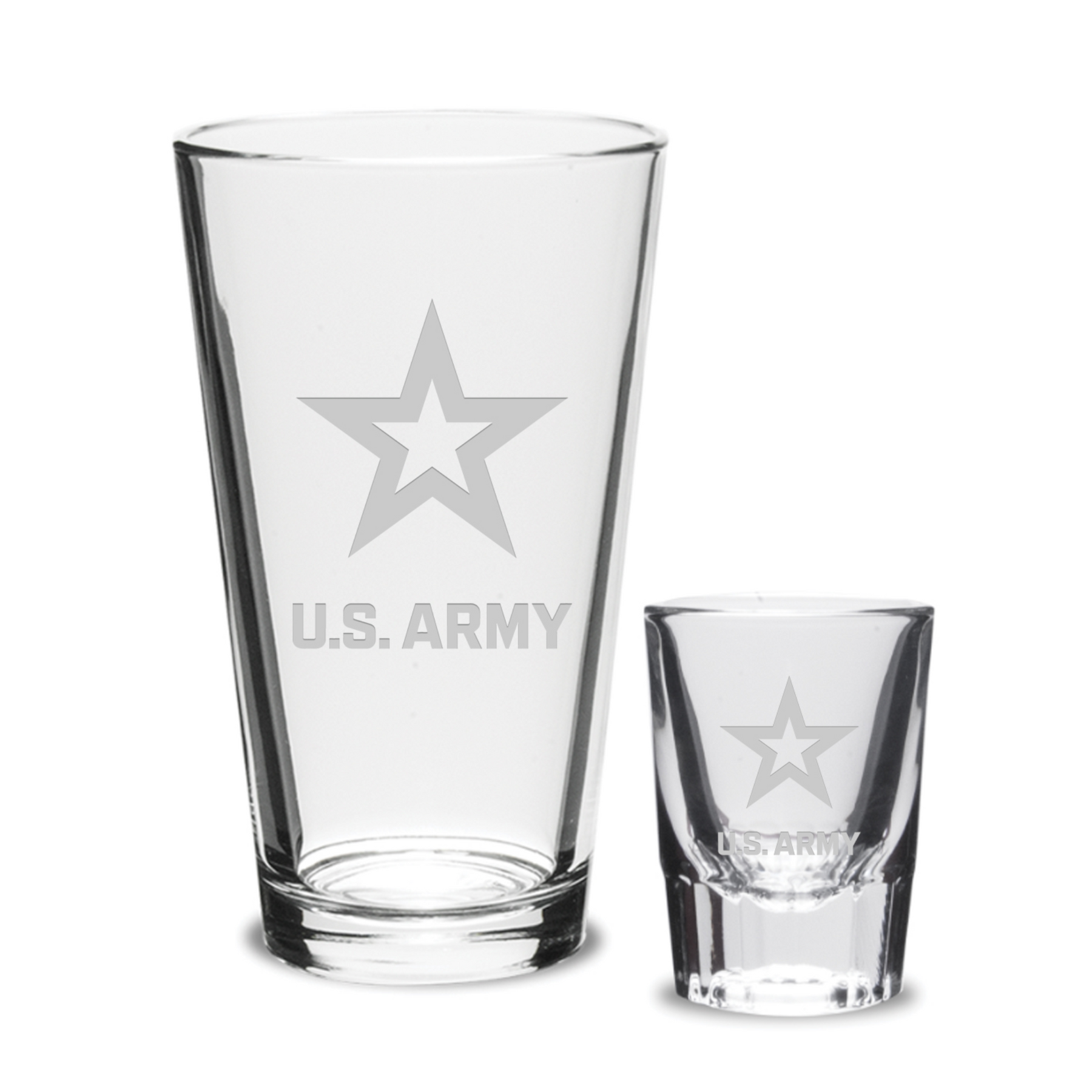 Step up your home entertaining game with the elegant Army Star16 oz Deep Etched Pub Glass and 2 oz Classic Shot Glass set. They also make a great gift!