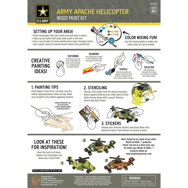 This US Army® Apache Helicopter Wood Craft & Paint Kit is made of real wood, and includes everything you need to create a beautiful work of art! The U.S. Army® Apache Helicopter Wood Craft & Paint Kit is the perfect gift for every art loving kid!