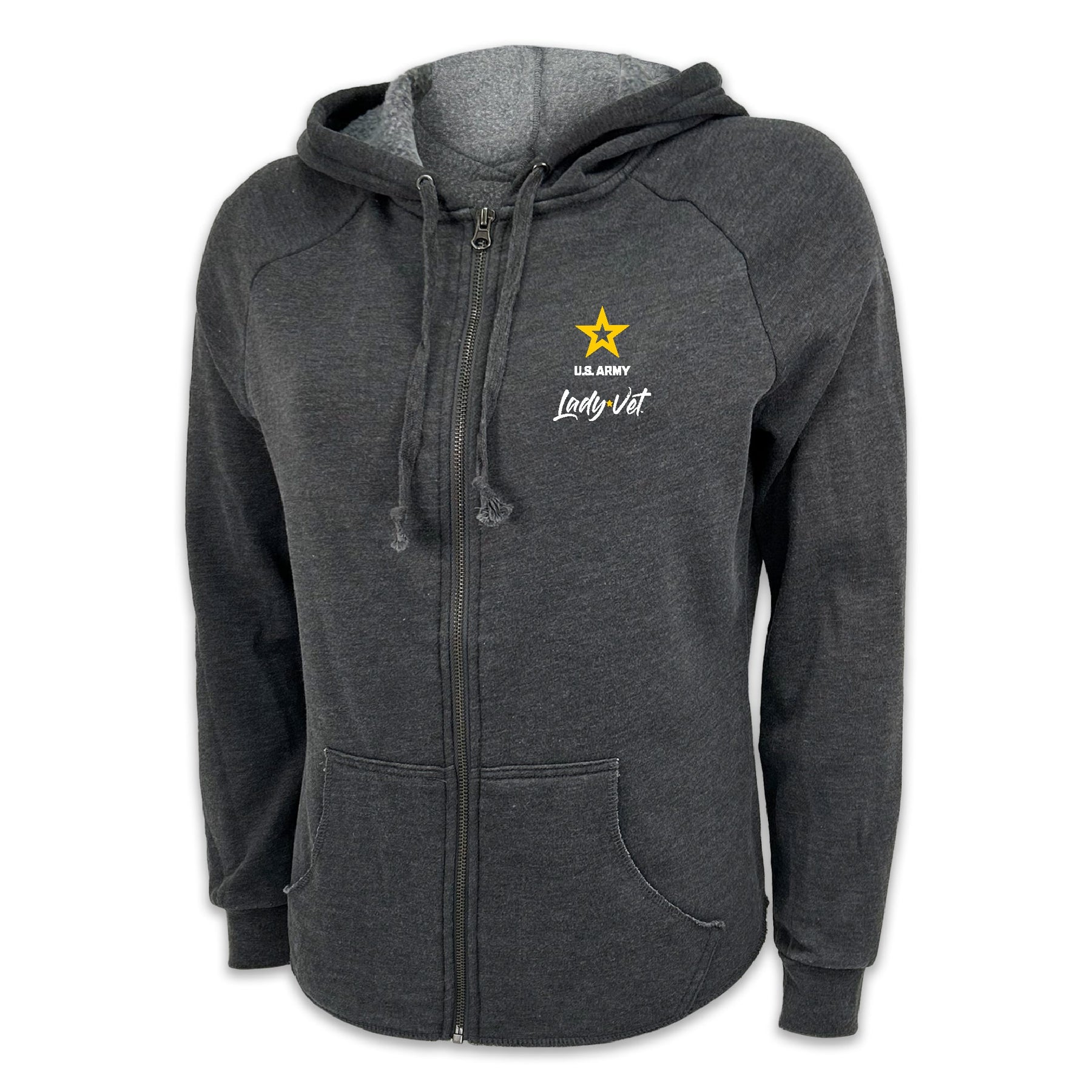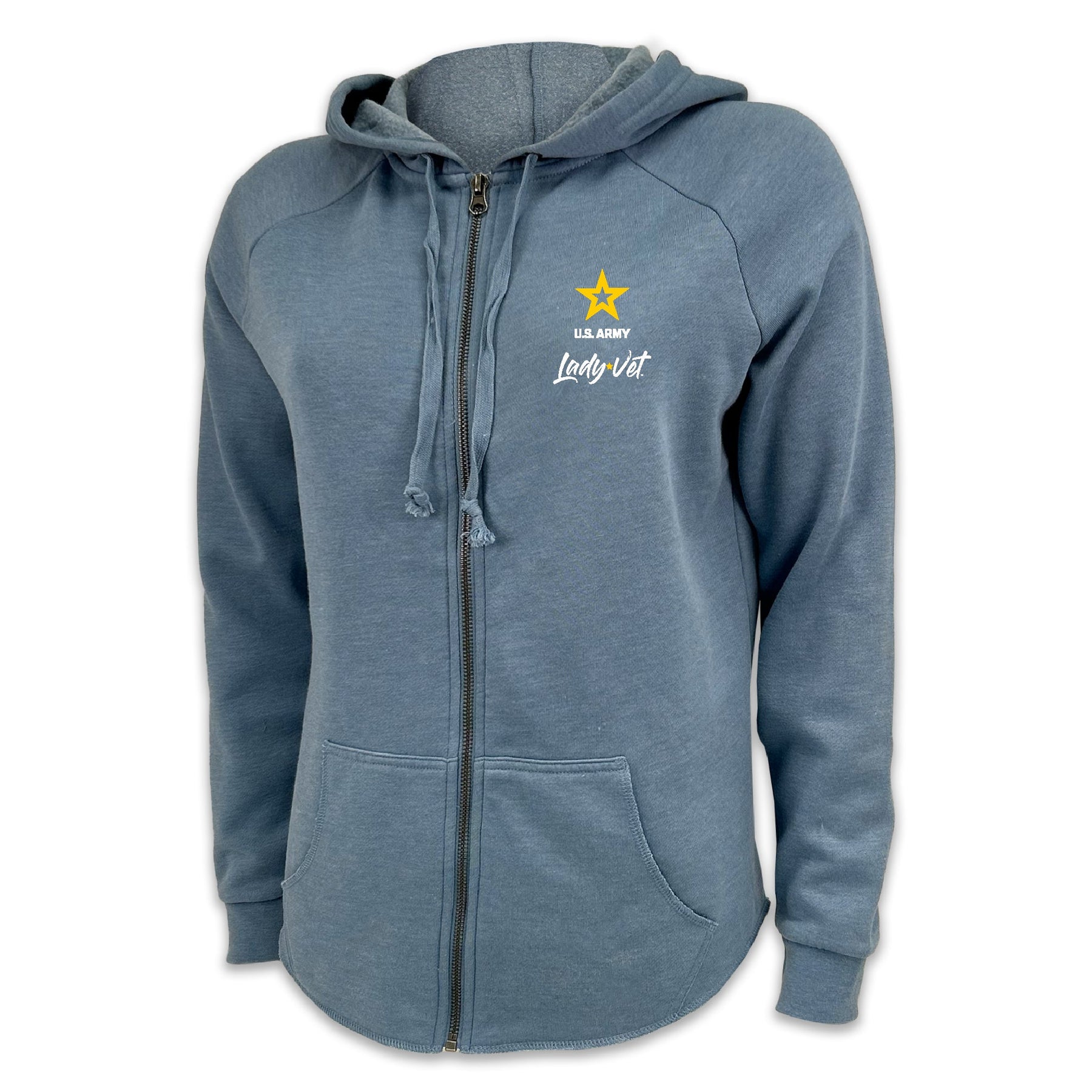 Stay warm and stylish with our Army Lady Vet Ladies Full Zip Hood! Made from a soft cotton blend fleece, this classic-fit hoodie features raglan sleeves and an antique nickel zipper—perfect for showing your Army pride in comfort.