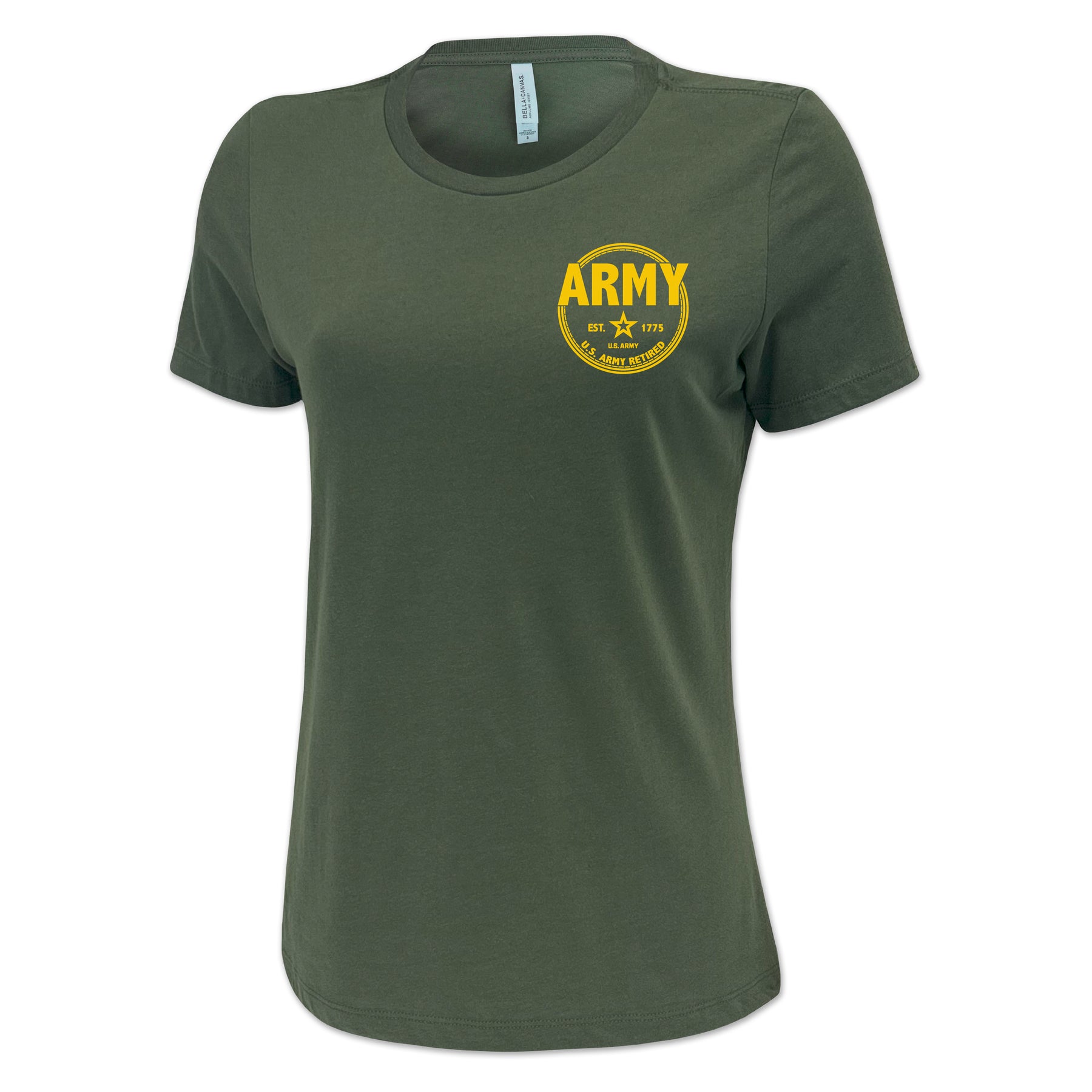This Army Retired Left Chest Ladies T-Shirt is a tribute to the brave women who have served in the Army. Featuring an all new design on the left chest, this shirt combines style and patriotism to honor the service and sacrifice of female Army retirees with a comfortable and expressive piece of apparel.