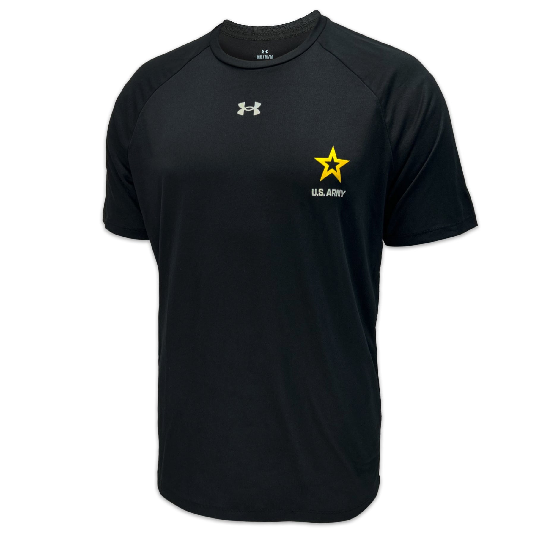 Introducing our Army Under Armour Left Chest Star Tech T-Shirt, featuring a sleek design with the iconic Army Star on the left chest, crafted with Under Armour's high-performance tech fabric for optimal comfort and durability. Show your pride in style while staying cool and dry!