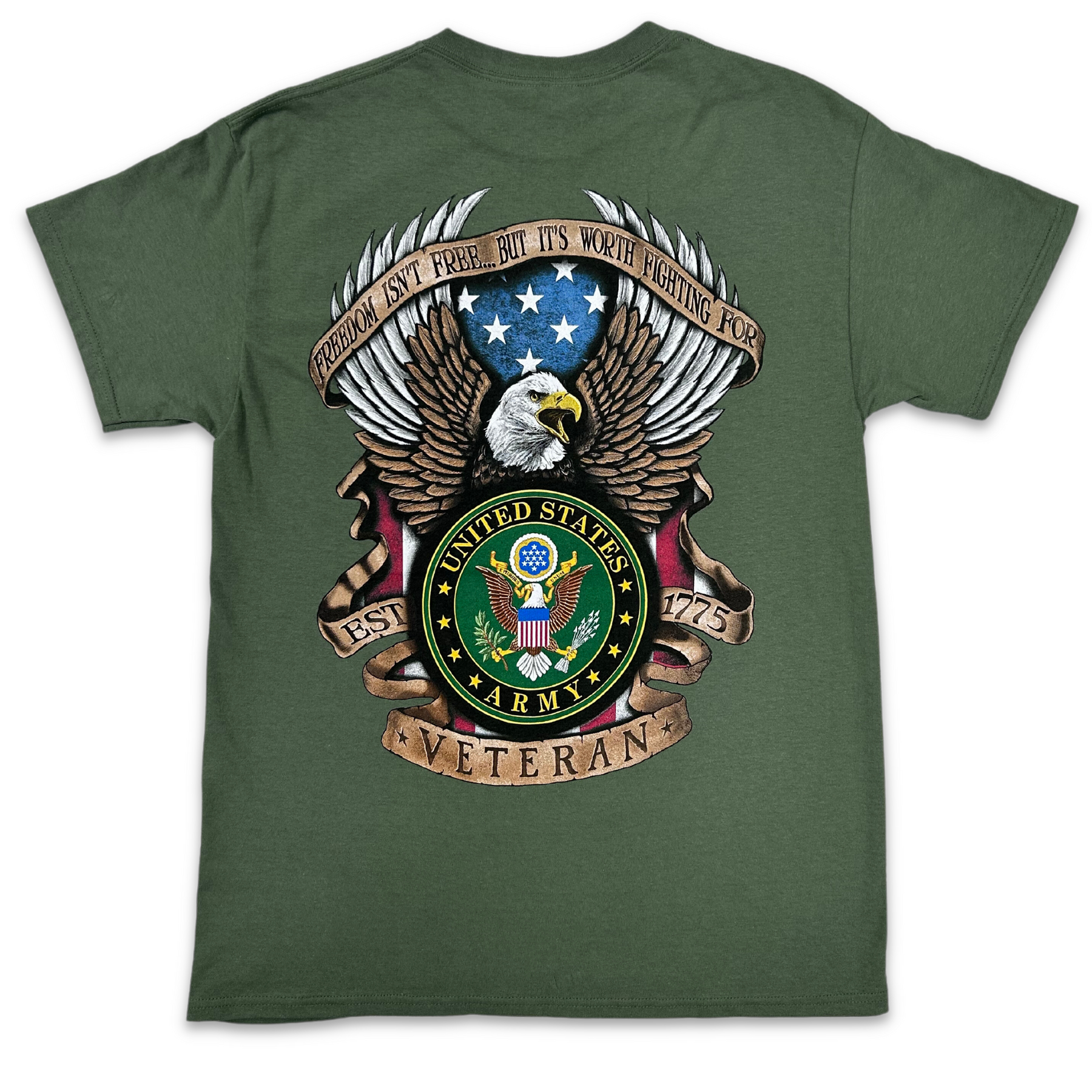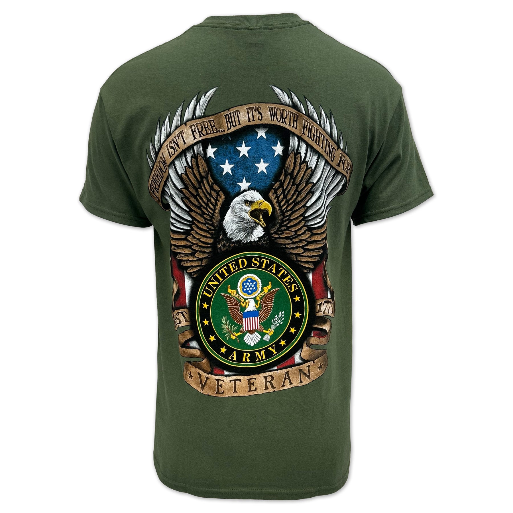 Show your pride and support for our brave veterans with this Army Veteran Freedom Isn't Free But It's Worth Fighting For T-Shirt. Comfortable and stylish - this tee is perfect for showing your dedication to those who have served!
