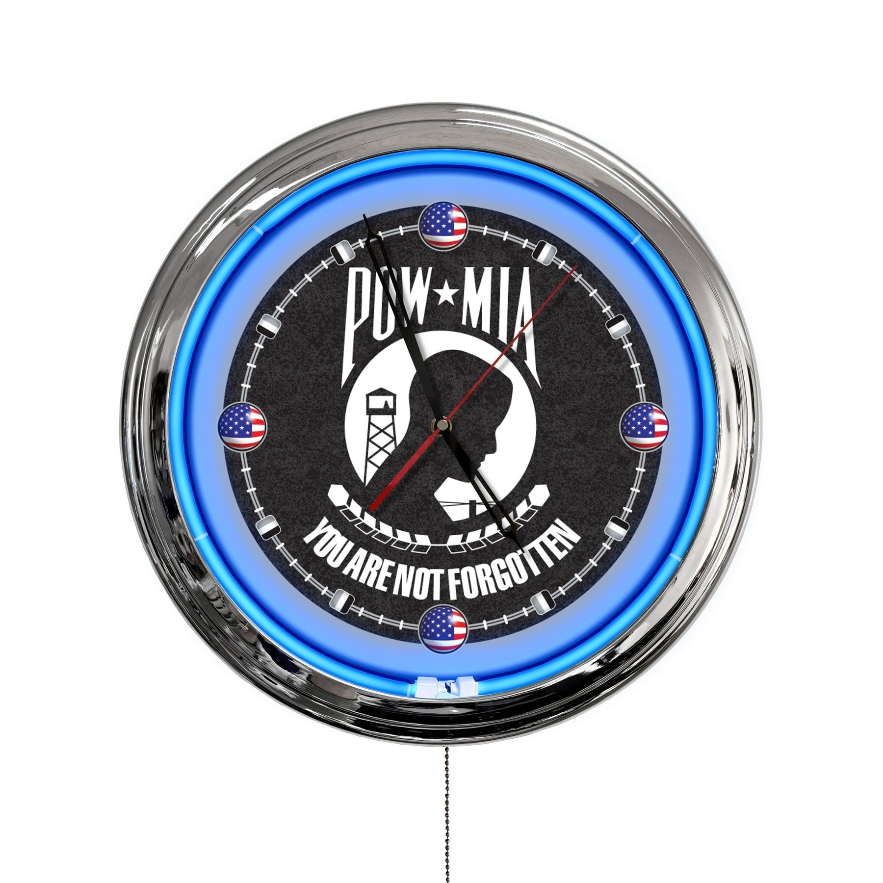 The POW/MIA Double Neon Wall Clock is the perfect way to show your support for our troops. Featuring a chrome casing and a color specific neon outer ring that accents the custom printed clock face. The Neon rings are easily turned on and off with a pull chain on the bottom of the clock, and are powered by a UL Listed power transformer that runs off a standard outlet. Accurate quartz movement ensures proper time and is powered by a single, AA battery (not included). Add a bold and vibrant touch to your decor while proudly displaying your support for our troops!