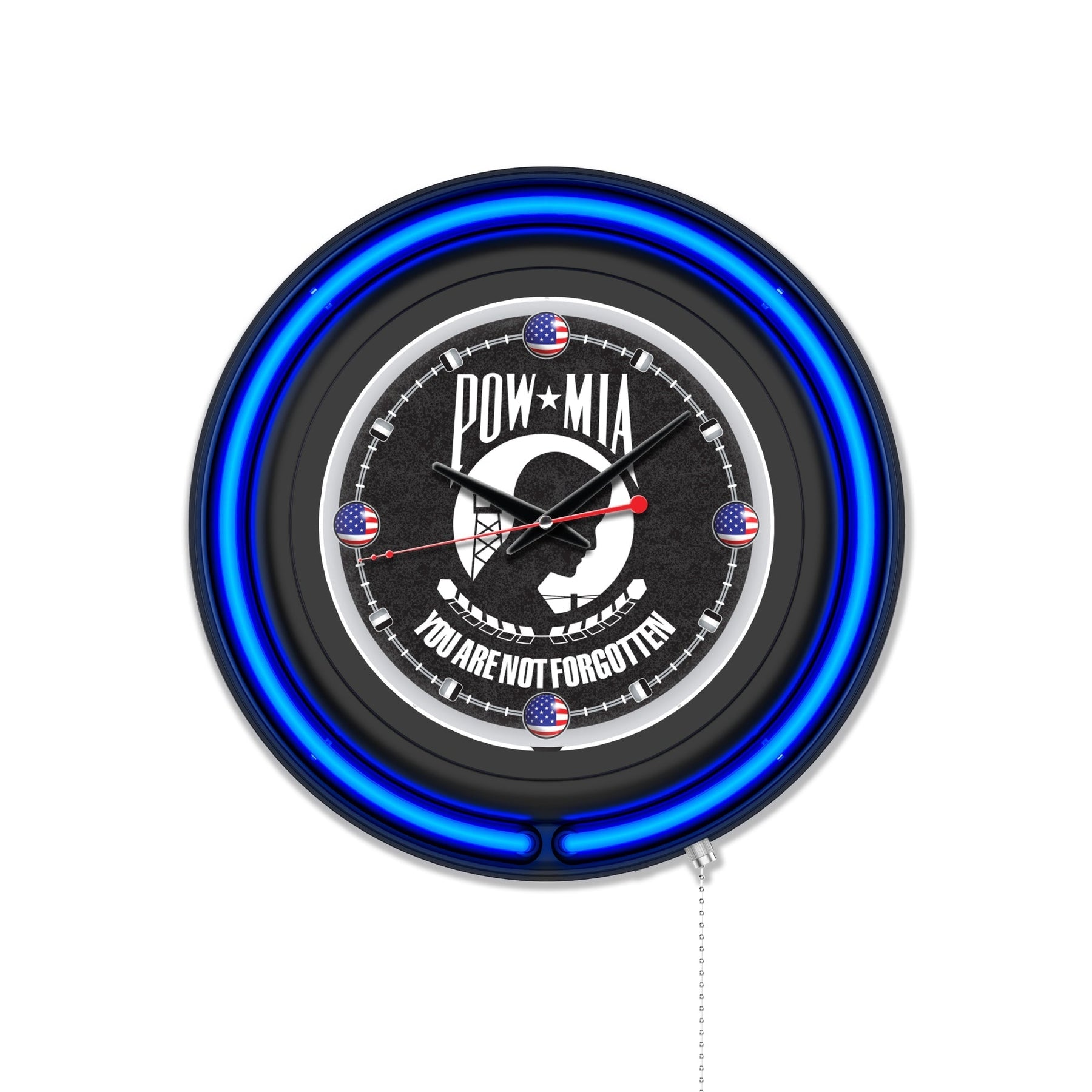 The POW/MIA Double Neon Wall Clock is the perfect way to show your support for our troops. Featuring a chrome casing and a color specific neon outer ring that accents the custom printed clock face which is lit up by an brilliant white, inner neon ring. The Neon rings are easily turned on and off with a pull chain on the bottom of the clock, and are powered by a UL Listed power transformer that runs off standard 120V outlet. Accurate quartz movement ensures proper time and is powered by a single, AA battery (not included). Add a bold and vibrant touch to your decor while proudly displaying your support for our troops!
