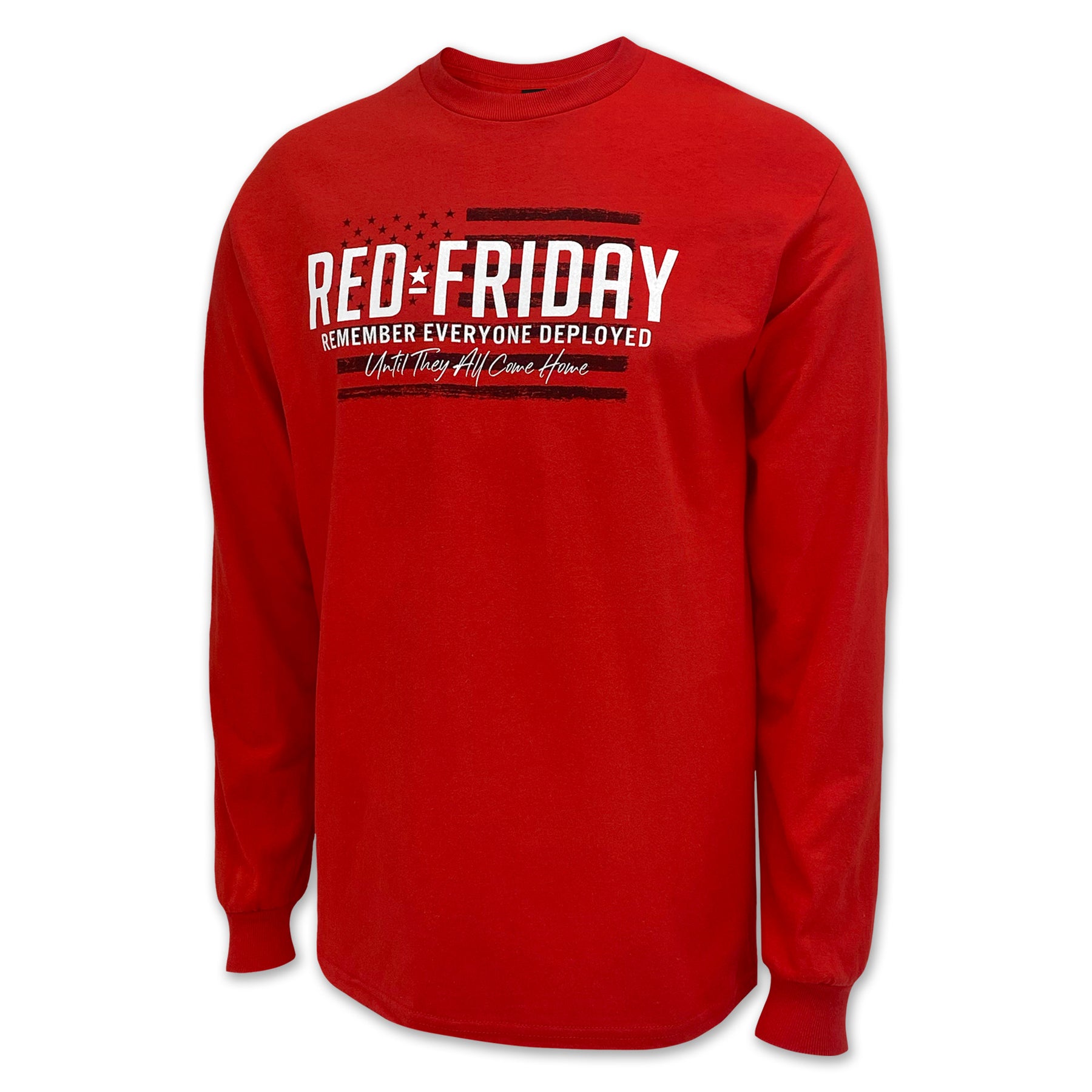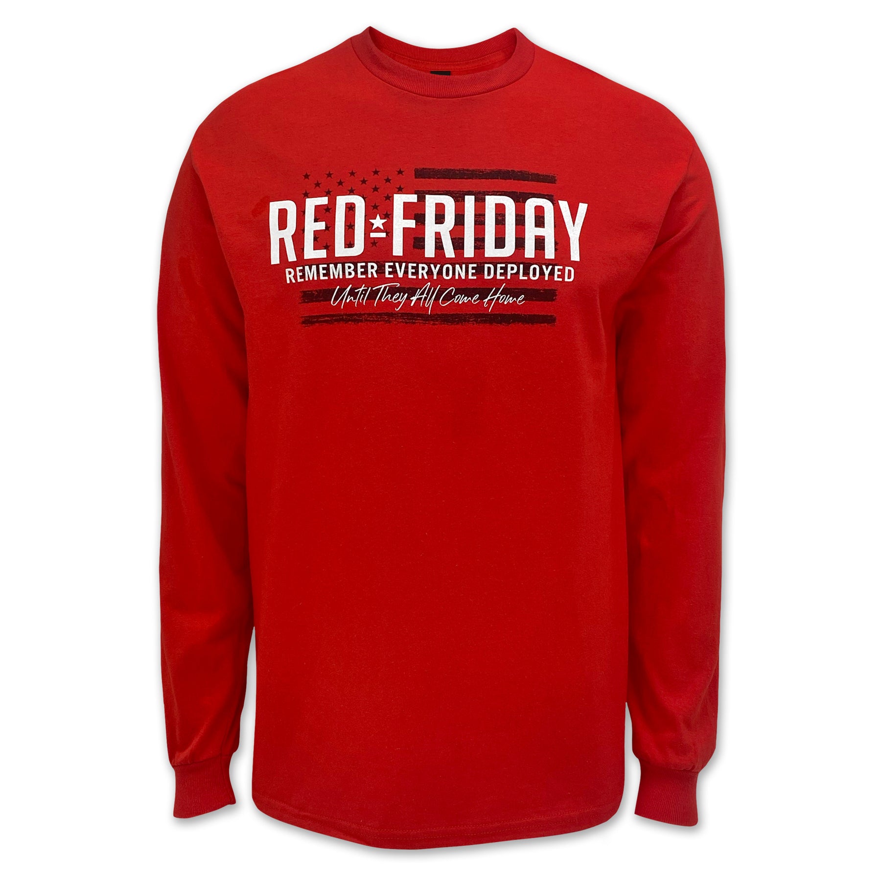 Show your support with the Red Friday Remember Everyone Deployed Long Sleeve T-Shirt. Made from soft, breathable cotton, this tee is a comfortable reminder to keep our deployed service members in your thoughts. Perfect for wearing every Friday or any day you want to honor their sacrifice.