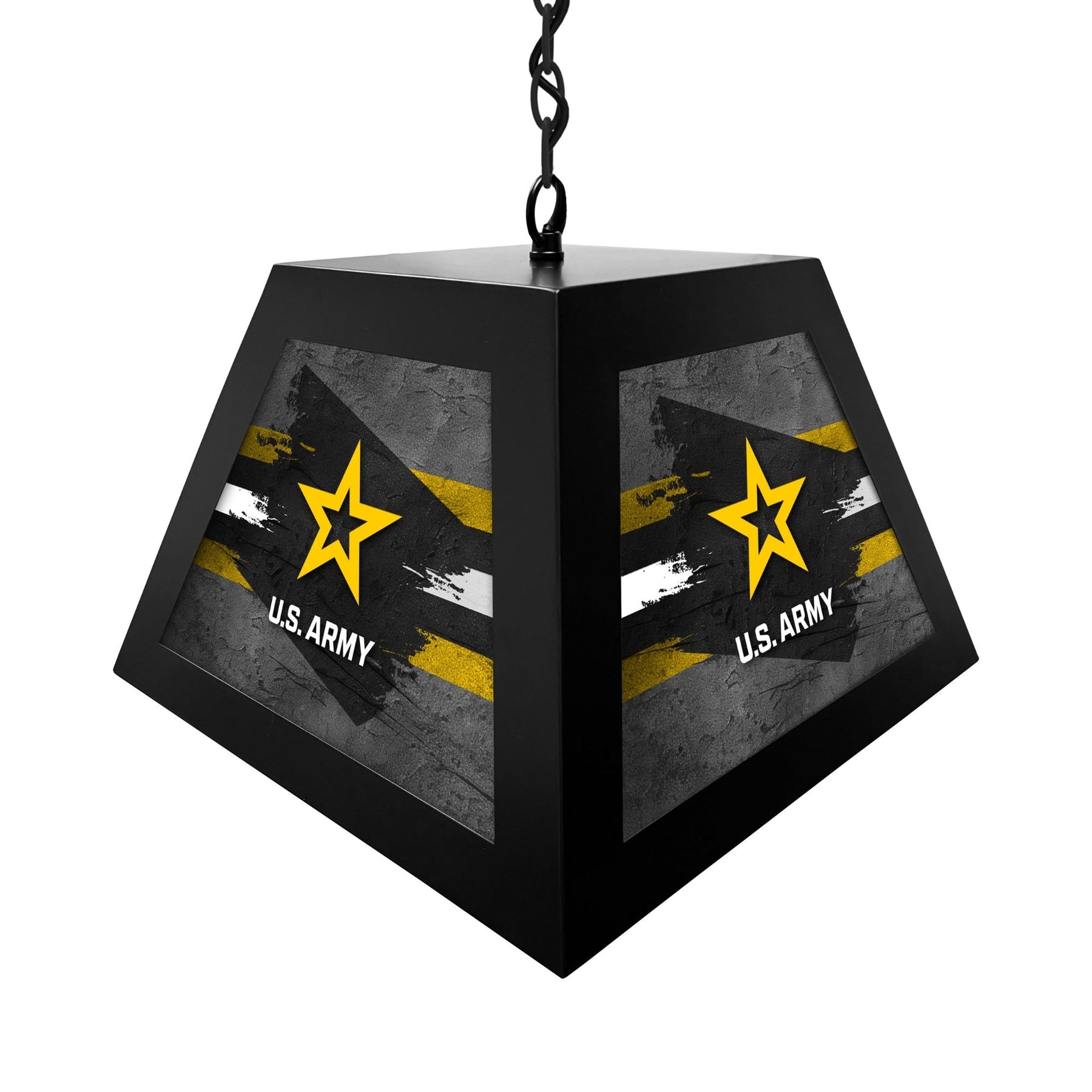 The United States Army Box Pendant Light is a stylish and durable lighting fixture, designed to add a bold touch to your billiard tables, game rooms, or bars. Featuring a sleek metal frame with vibrant, backlit graphics, this light creates a dynamic ambiance. Whether used for a nostalgic reminder or to accent any living or work space, this light makes a great statement!