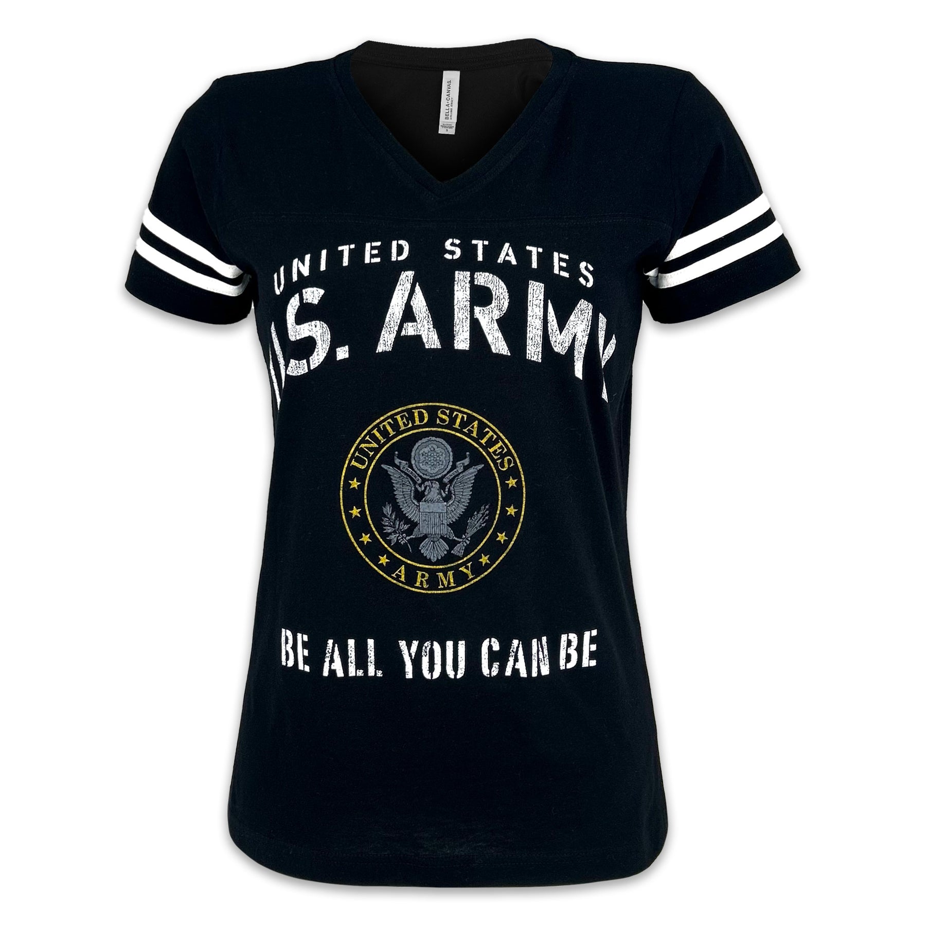 Introducing the United States Army Ladies Vintage Stencil T-Shirt! Your favorite vintage design is back, now in a ladies' fit. Made with ultra-soft, lightweight fabric and finished with chic sleeve stripes, this tee is perfect for any occasion.